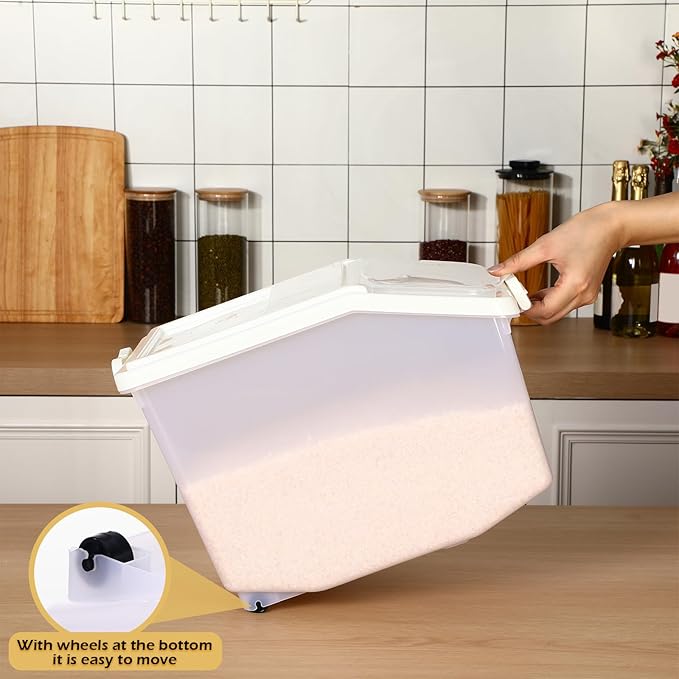 - Rollers Design: flour storage container is installed with tilting rollers at the bottom for easy movement, even when filled with rice, you can easily move it without the effort of carrying it, saving time; The storage container features a large, clean, slanted opening for easy finding and removing food; There are 2 wheels hidden behind the food storage container, so you can easily move it by simply lifting the front