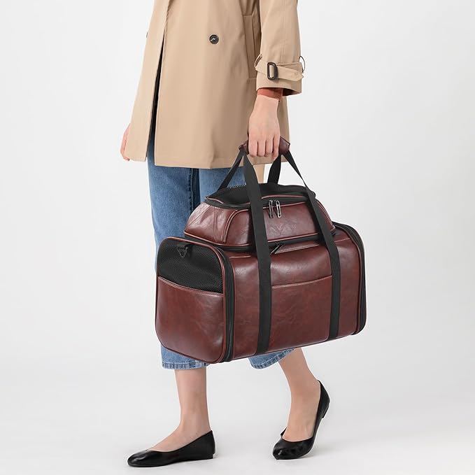 Premium Leather Top Expandable Pet Carrier for Small Dogs & Cats Under 15 lbs, Airline Approved Collapsible Soft-Sided Luxury Travel Bag Coffee