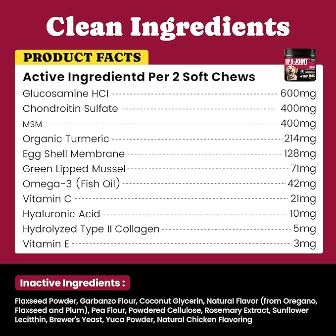 - 【Enhance Flexibility & Mobility】 Our dog joint chews, featuring glucosamine, turmeric, and omega-3, work together to reduce inflammation, improve flexibility, and promote overall joint health.