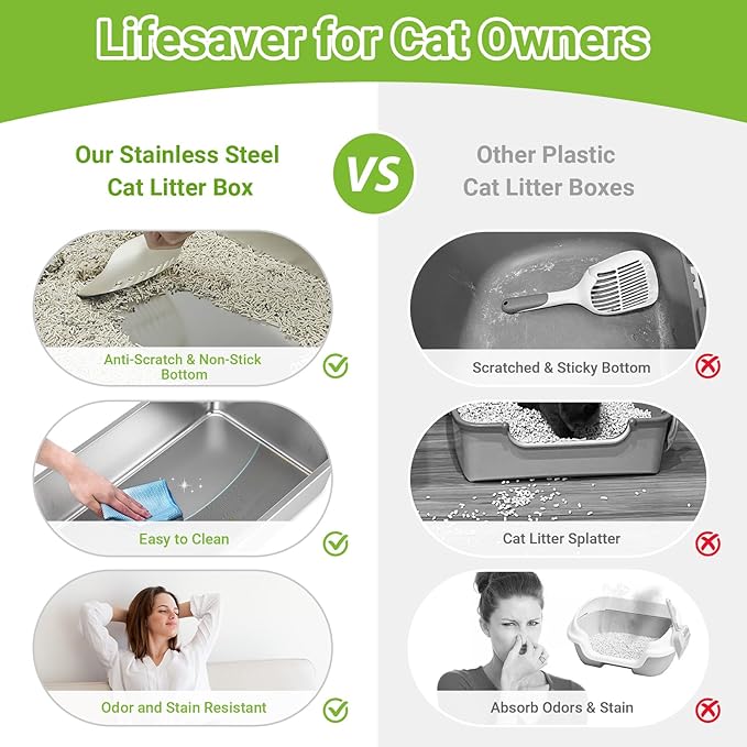 - BEST CHOICE FOR BIG & MULTIPLE CATS- The cat litter box stainless steel can accommodate two large adult cats at the same time. Large adult cats weighing up to 30 pounds can turn around freely inside the high side litter box, and the height of the cat litter pan prevents litter or cat urine from spilling over the sides, not only keep litter contained but also give cats a sense of privacy, making them feel at ease and secure when using the litter box. If you have more than one cat in your home, look no further than the LIHONG large litter box.