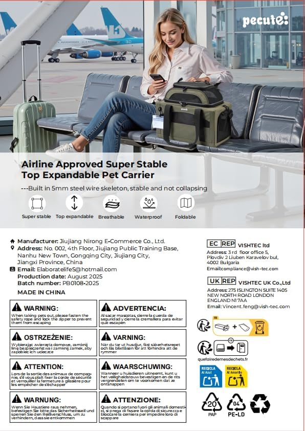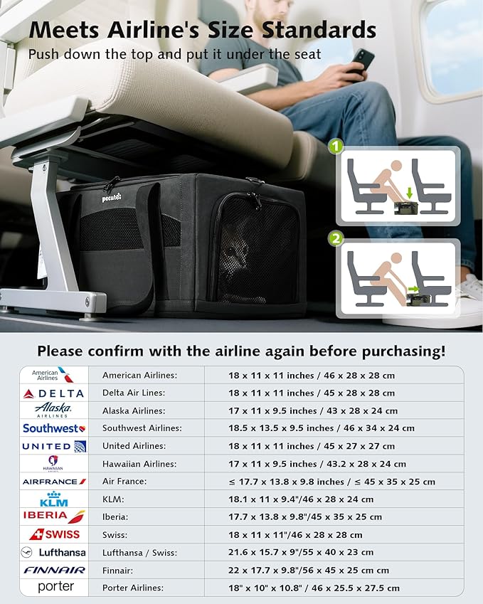 - 【Airline Approved Pet Carrier】Pecute pet carrier size:16.5"L x 11"W x (9+4.7)"H.Product weight: 3.9lbs. Pecute pet carrier is airline approved and can be placed underneath the seat directly in front of you in the cabin. The following airlines are eligible: American Airlines(18"L x 11"w x11"H), Delta Airlines(18"L x 11"w x11"H), United Airlines(18"L x 11"w x11"H), Alaska Airlines(17"L x 11"w x9.5"H), Southwest Airlines(18.5"L x 13.5"w x9.5"H), Hawaiian Airlines(17"L x 11"w x9.5"H), Frontier Airlines(18"L x 14"w x11"H). Recommended for pets under 11 lbs.