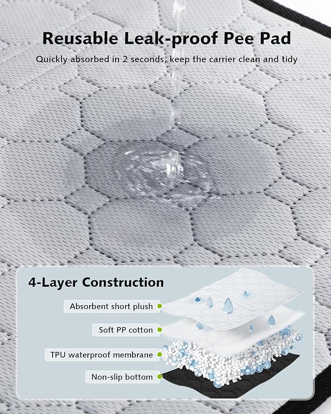 - 【Reuseable Leakprrof Pee Pad & Storage Bag】The bottom of the pet carrier bag is equipped with a reusable leak-proof pee pad to avoid accidents when the pet is out. The side storage pocket can also store some necessities that the pet needs immediately.