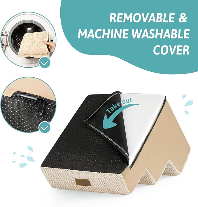 - Non-Slip Base and Removable Cover: Our dog steps for beds are equipped with a non-slip base featuring rubber dots for extra grip, minimizing movement during use. The pet steps cover is waterproof inner side, so you don’t have to worry about stains seeping into the foam. The outer cover is removable and machine washable for easy cleaning