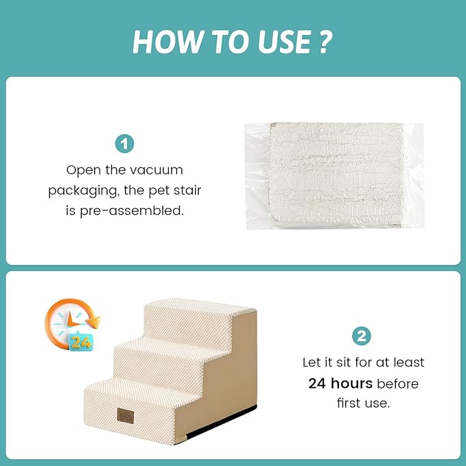 - Easy to Use: Dog stairs are vacuum-compressed and packed together after assembly, so after taking it out of the vacuum-sealed package, please let the sponge sit for 48 hours to fully expand before use. Slight wrinkles on the cover sides may appear after unpacking but can be smoothed out by washing or ironing