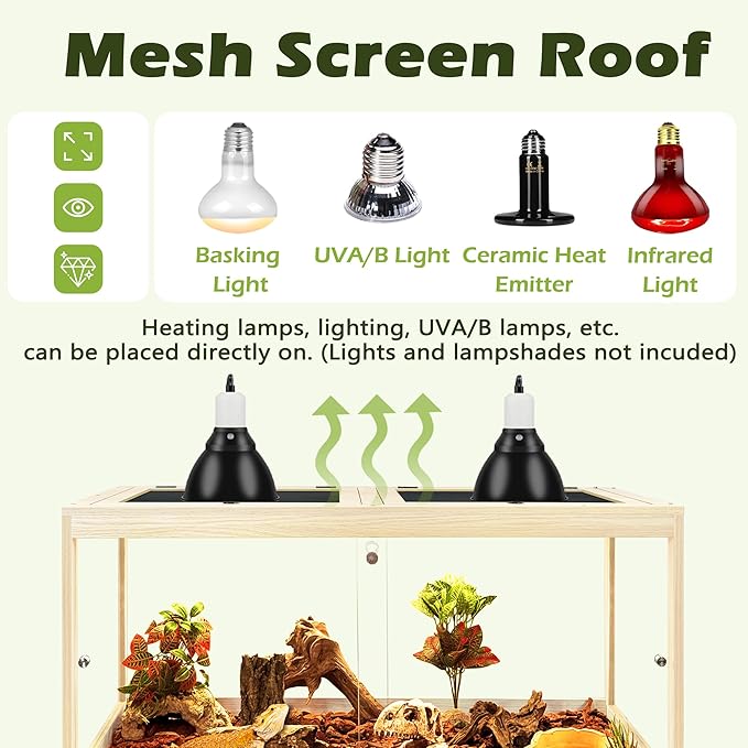- 【Thoughtful Functional Design】Equipped with front doors for smooth access, the enclosure also includes a secure locking mechanism to keep your pet contained. The metal mesh top promotes proper ventilation and is ideal for mounting heat lamps or UVA/UVB lighting (not included), maintaining optimal living conditions for your reptiles.