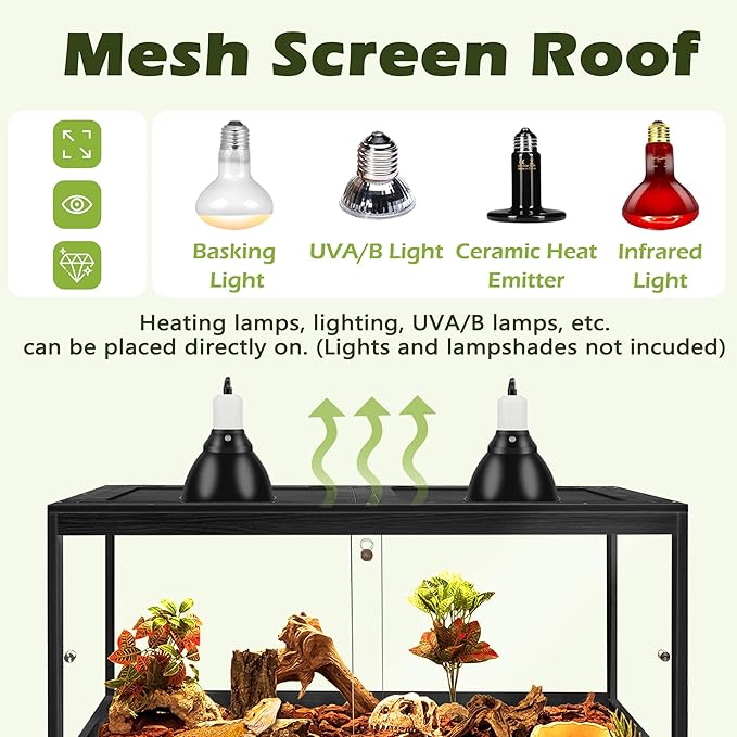 - 【Functional Design】Our terrarium is thoughtfully designed with a user-friendly layout. The double sliding front doors glide effortlessly and feature a secure locking mechanism to ensure your pets remain safe and secure. The top is equipped with durable metal mesh for optimal airflow, ideal for positioning heat lamps and UVA/B lights (not included) to maintain precise environmental conditions.