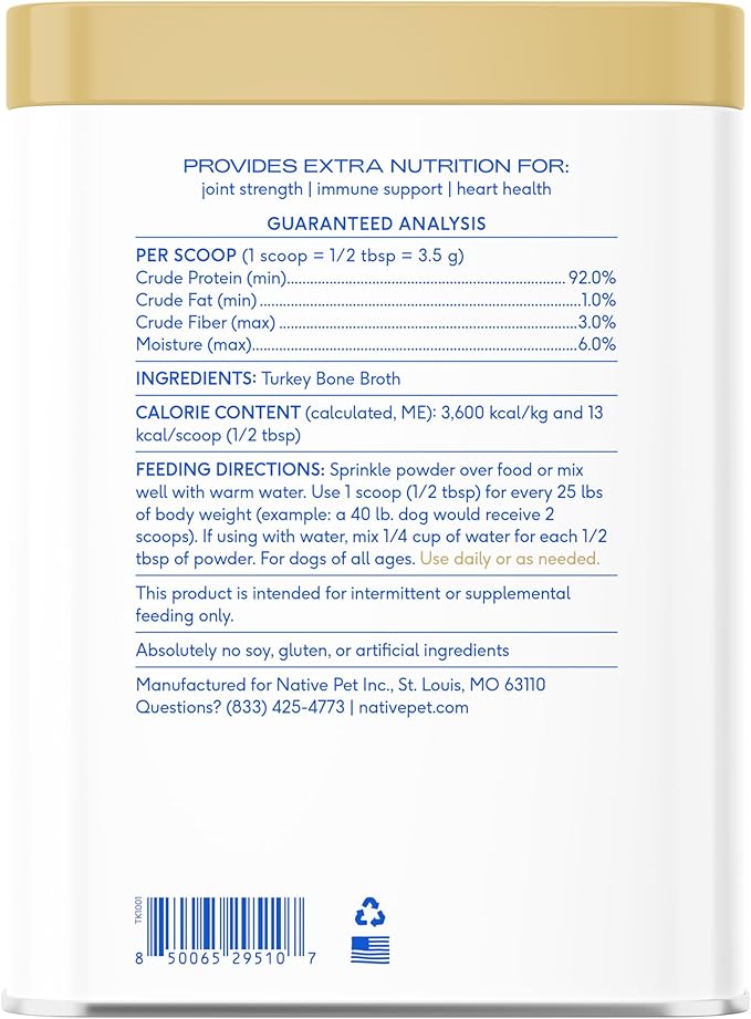 Native Pet Bone Broth for Dogs and Cats - Turkey Bone Broth Powder Dog Food Toppers for Picky Eaters - Provides Extra Nutrition for Joint Strength, Immune Support & Heart Health - 96 Scoops