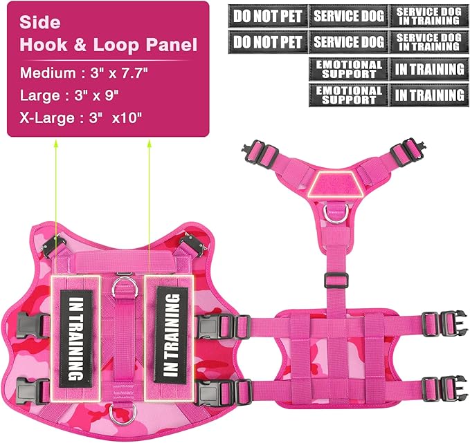 - 【Molle System】: Equipped on both sides for pouches, water bottles, and tactical dog gear. Multiple Hook & Loop Panels for morale patches and badges to showcase your dog’s personality. A wide range of use for personal service, law enforcement, hunting, or outdoor recreation. The package contains a dog harness, and 10 pieces of dog patches, such as Service dog, do not pet, in training, emotional support and service dog in training, enough quantity for you to decorate the dog’s vest harness.