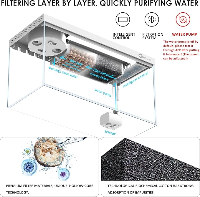 - All-in-One Smart Glass Fish aquarium kit: The Premjin fish tank kit features an all-in-one design that is ready to use without installation. Control your fish tank via Bluetooth connectivity - remotely adjust lights, feeding times and pump power levels. The water pump is off by default, please test it through APP after putting it into water! (The power can be adjusted!). Say goodbye to complicated setups!