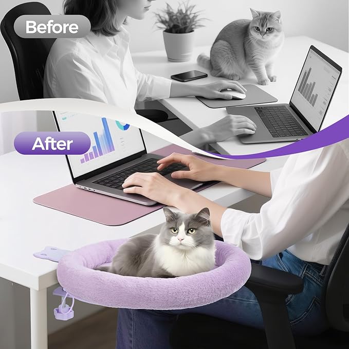 Rotating Cat Desk Bed - 40 LBS Chair-Side Cat Sleeping Basket with Bed for Desk, 360° Swivel & Removable Washable Cushion for Office Comfort(Purple