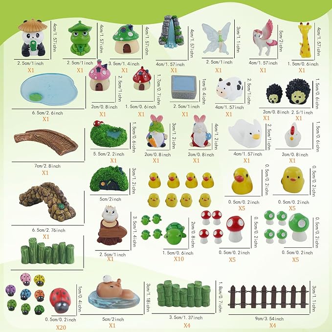 - Extensive 82-Piece Collection: Create enchanting miniature kingdoms with a vast variety! This set includes charming tiny houses, rustic bridges, adorable animals, and more – everything needed to build immersive fairy gardens, gnome villages, or whimsical terrarium landscapes.