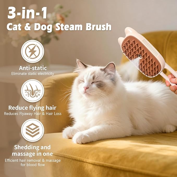- 3-in-1 Grooming Efficiency: This 3-in-1 Steam Cat steam brush combines cleaning, shedding, and massage in one. Removable brush head is easy to rinse clean. Ultra-quiet motor (<25dB) keeps even the most skittish pets calm during use.