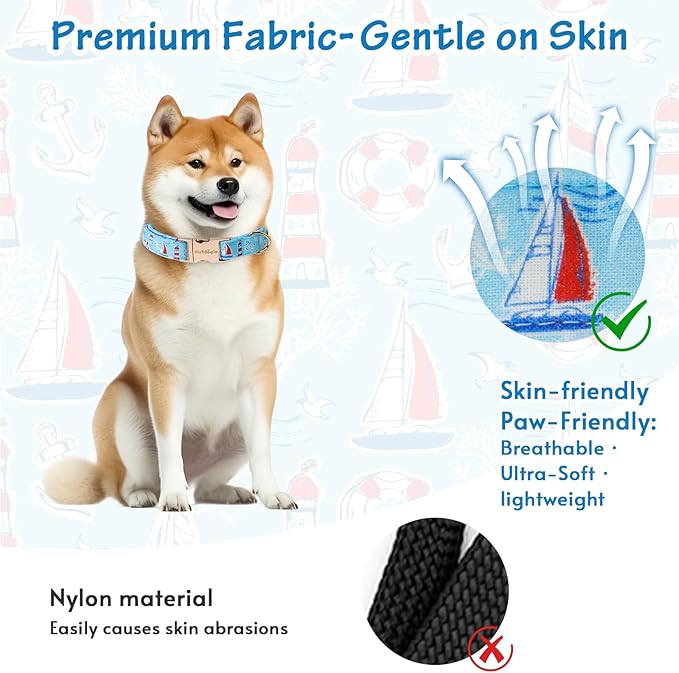 Nautical Themed Dog Collar,Handmade Cotton Puppy Collar with Sailboats,Seagulls Parttern, Adjustable Colllar for Small Medium Large Dogs, Perfect for Daily Walks, Photos,Beach & Vacation- L