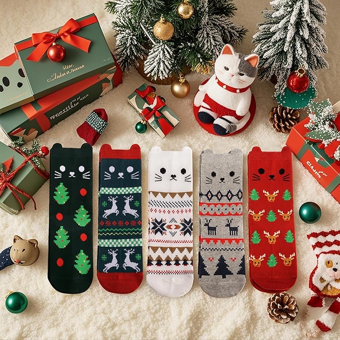 - Cute design: Each pair features adorable cat faces, and the cuffs are designed to resemble cat ears, adding a playful touch. The socks are also decorated with reindeer, Christmas trees, and symmetrical geometric patterns inspired by Nordic design, creating a festive holiday atmosphere. Enjoy hot chocolate by the warm fireplace while wearing these fun socks and embracing the holiday spirit.