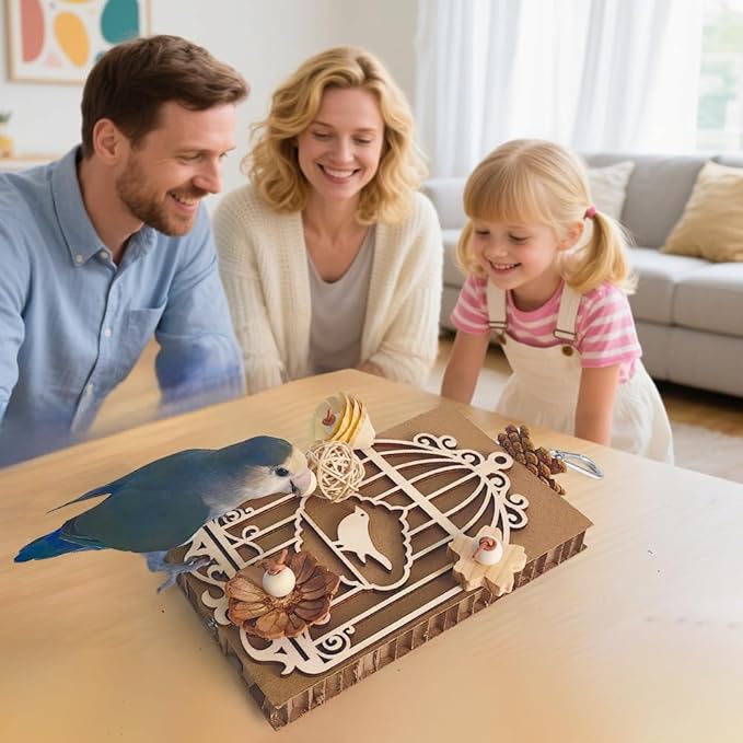 - Instinct Stimulation Multi-layer cardboard design incorporates natural elements perfect for bird tearing, rolling, and chewing, simulating wild foraging environments. Parrots can peck at corn cob strands, nudge wooden beads, tear rush grass, or gnaw on apple wood blocks - ensuring hours of interactive fun for your birds every day!
