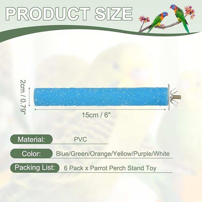 - Product Specifications:Size:15 x 2 cm / 6 x 0.79 inch (L x W); Color: Blue/Green/Orange/Yellow/Purple/White; Material: Wood; Packing List: 6 Pack x Parrot Perch Stand Toy