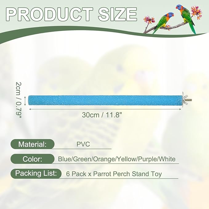 - Product Specifications:Size:30 x 2 cm /11.8 x 0.78 inch (L x W); Color: Blue/Green/Orange/Yellow/Purple/White; Material: Wood; Packing List: 6 Pack x Parrot Perch Stand Toy