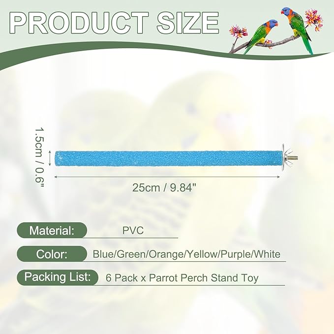 - Product Specifications:Size:25 x 1.5 cm / 9.84 x 0.6 inch (L x W); Color: Blue/Green/Orange/Yellow/Purple/White; Material: Wood; Packing List: 6 Pack x Parrot Perch Stand Toy