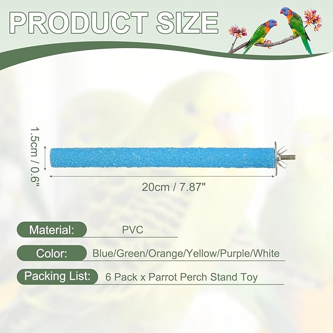 - Product Specifications:Size:20 x 1.5 cm / 7.87 x 0.6 inch (L x W); Color: Blue/Green/Orange/Yellow/Purple/White; Material: Wood; Packing List: 6 Pack x Parrot Perch Stand Toy