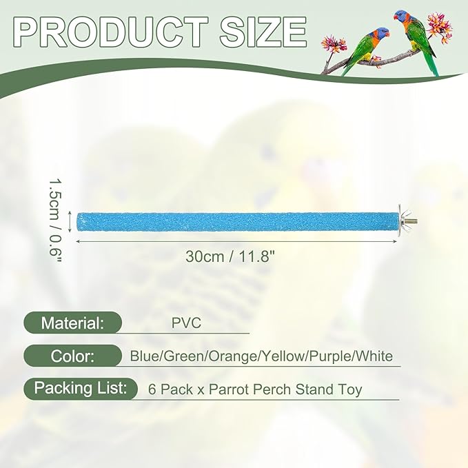 - Product Specifications:Size:30 x 1.5 cm /11.8 x 0.6 inch (L x W); Color: Blue/Green/Orange/Yellow/Purple/White; Material: Wood; Packing List: 6 Pack x Parrot Perch Stand Toy