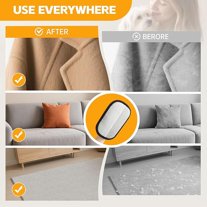 - Suitable for any fabric: effortlessly removes pet hair, lint, and debris from clothes, furniture, car seats, bedding, interior decor, carpets, etc., making it the preferred tool for all hair removal needs. For optimal results, please use on a dry surface.