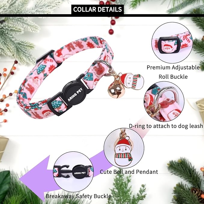 ARING PET 2 Pack Cat Collar, Christmas Breakaway Kitten Small Collars with Bells for Girl Boy Cats-Pink Reindeer Santa Claus & Green Xmas Tree