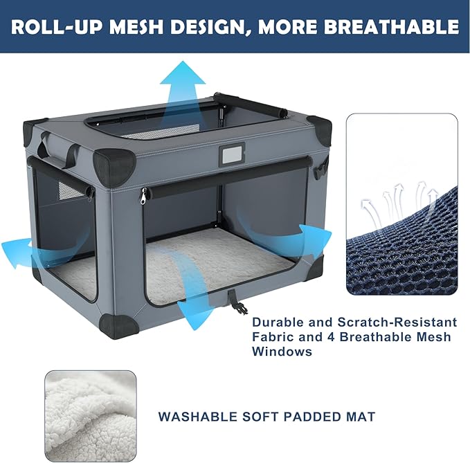 - 【Breathable and Comfortable Environment】 The collapsible dog crate is equipped with three mesh doors (top, front and side) for easy access to your pet. Meanwhile, four breathable mesh walls ensure optimal ventilation, creating a comfortable and healthy resting space for your pet
