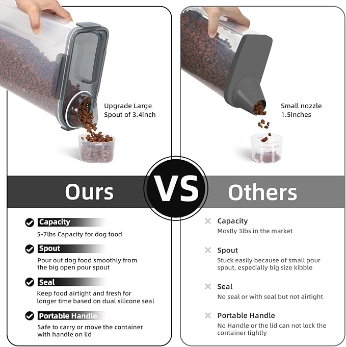 - WHAT YOU GET?:The small dog food bin comes with a 1-pack airtight pet food storage container with a clear measuring cup and an upgraded large spout for easy pouring of pet food at any time. This dog food storage containers can be a gift The perfect gift for any home.