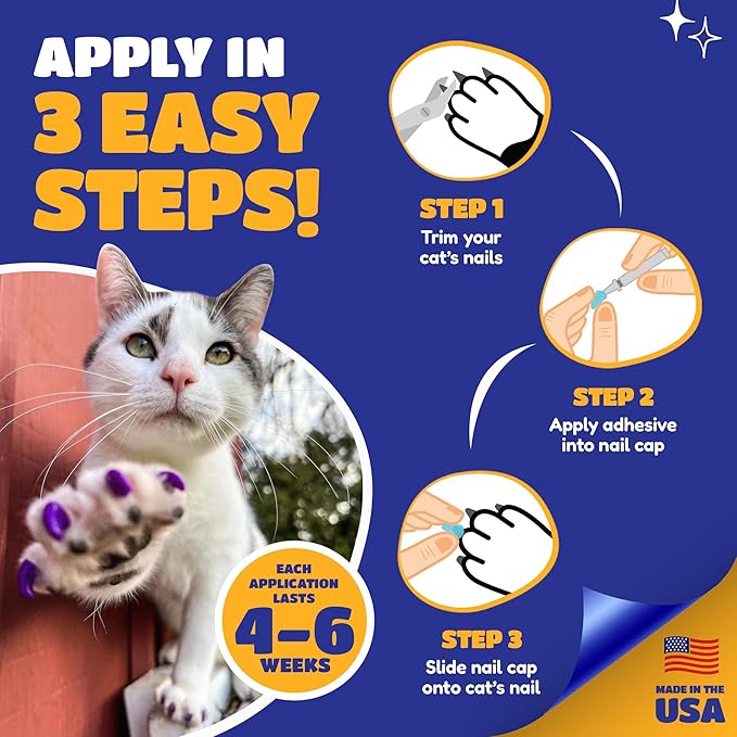 - EASY TO APPLY IN 3 STEPS: Simply trim nails, apply adhesive into cap, and slide onto nail. Each application lasts 4-6 weeks and the soft, lightweight design naturally shed as claws grow, making maintenance effortless. Detailed instructions included for a stress-free application. Veterinarians and groomers love Soft Claws and can also help with application!