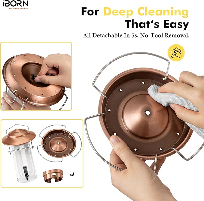 - 【iBorn Patent Design T Bar All Detachable for Easy Cleaning】—No Tools, No Hassle. For deep cleaning, iBorn designed a quick release mechanism for this small bird feeder. Just tighten the wingnut at the bottom,every piece detaches for thorough water cleaning, water effortlessly removes dust and seeds, then gently wipe with a cloth – Like New in Seconds,ensuring fresh, healthy seed for your bird visitors.