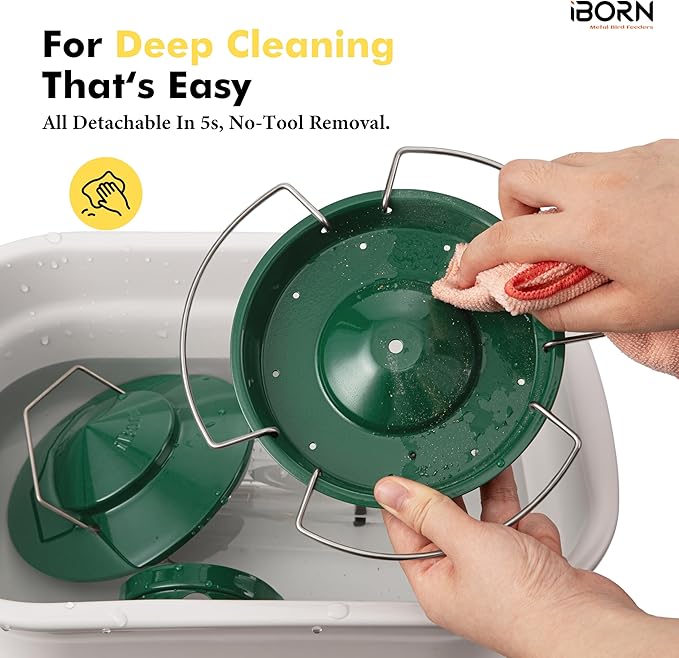 - 【iBorn Patent Design T Bar All Detachable for Easy Cleaning】—No Tools, No Hassle. For deep cleaning, iBorn designed a quick release mechanism for this small bird feeder. Just tighten the wingnut at the bottom,every piece detaches for thorough water cleaning, water effortlessly removes dust and seeds, then gently wipe with a cloth – Like New in Seconds,ensuring fresh, healthy seed for your bird visitors.