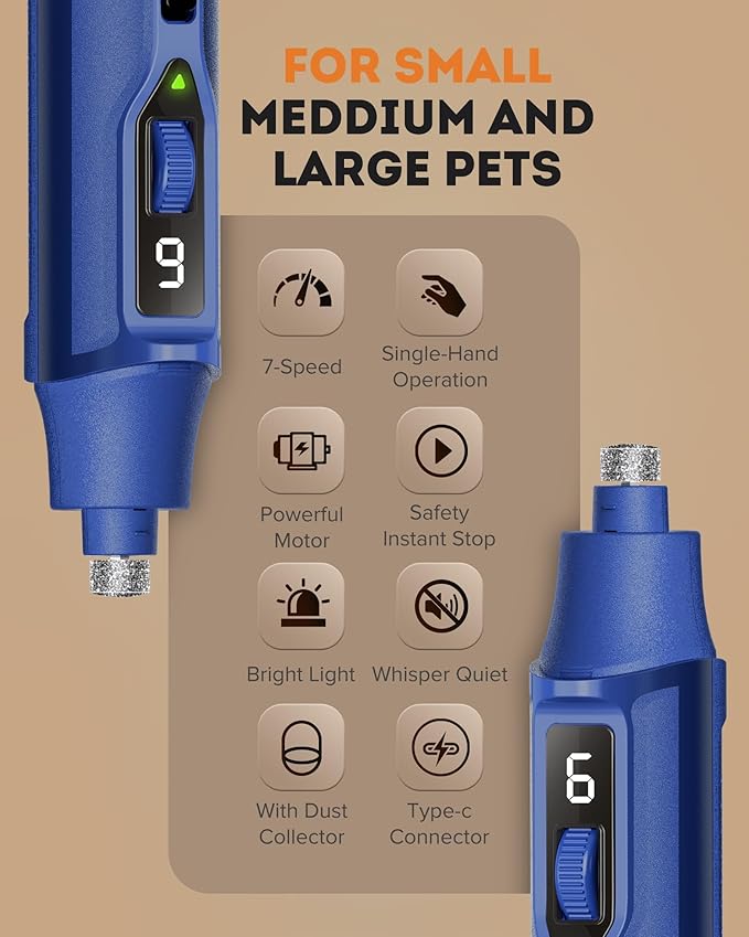 - 7 SPEEDS ADJUSTABLE: Ranging from 8,000 to 15,000 RPM, as one of the most powerful grinders, ideal for trimming the nails of small, medium, and large dogs, cats, birds, and other small animals