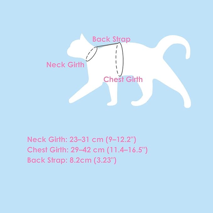 - FULLY ADJUSTABLE CAT HARNESS & LEASH SET — Fits neck 23–31 cm (9.6–12.2 inches), chest 29–42 cm (11.42–16.5 inches); includes a 125 cm (4.1ft) adjustable leash. The strap from neck to chest is 8.2 cm (3.2 inches) long. Back straps also adjust for a snug, non-chafing fit for kittens and adult cats—great for walking, travel, and outdoor use. Recommended for 2–6 kg / 4.4–13.2 lb cats. Before purchase, please measure your cat.