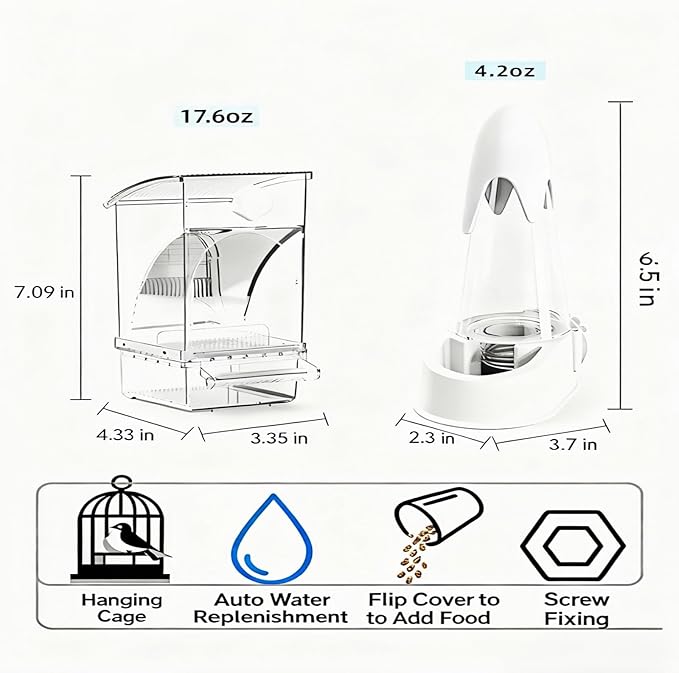 - 3.Large Capacity for Extended Use The feeder could stock about 500g(17.6oz) seeds, lasting about 7-15 days for most birds. The 125ml water tank ensures fresh supply. You can rest assured to go on vacation or work—no need to worry about your pets getting hungry. Ideal for parakeets, cockatiels, lovebirds and other small/medium birds.
