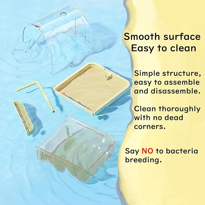 - 【Flexible Placement & Effortless Cleaning】This versatile bird bath can be placed directly inside the cage or used independently on a tabletop. The secure latch design keeps it stable and easy to attach or remove when needed. Its detachable base simplifies draining and refilling, while the waterproof structure prevents splashing or leaks. Cleaning takes only minutes—saving time while keeping your pet’s space neat and tidy.