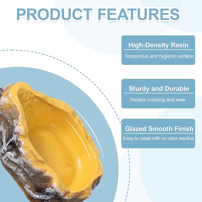 - Quality Materials: The reptile food bowl is made from premium-quality resin. Odorless and easy to clean. With a lightweight yet sturdy build, it can stay with your pets for years to come, is very stable, and not easily tipped over by larger reptile.