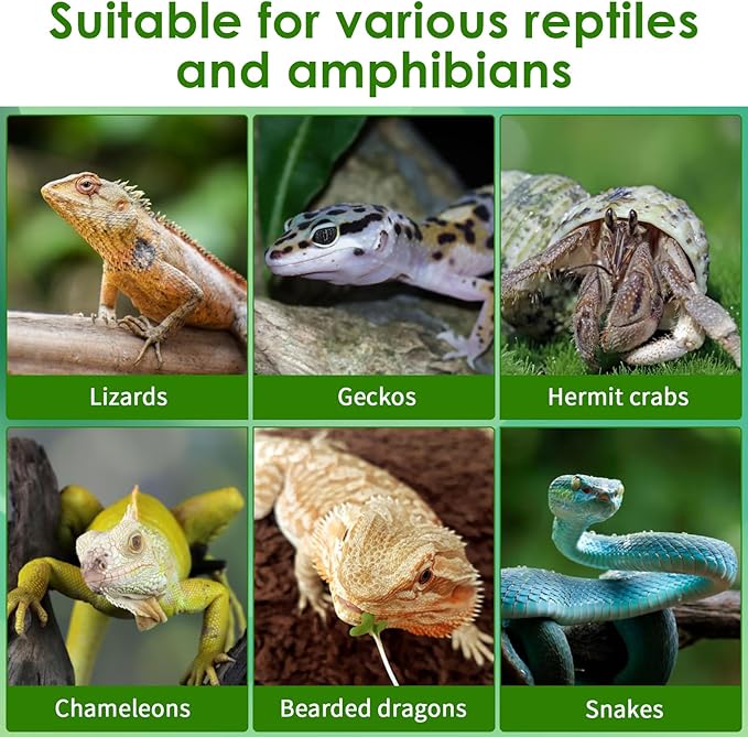 - Widely Suitable: The reptile tank water dish is suitable for a variety of reptiles, including bearded dragons, lizards, leopard geckos, hermit crabs, chameleons, snakes, birds, and more. Whether providing water or feeding your pet, it's easily adaptable. Its compact design makes it ideal for placement in a variety of reptile habitats, including glass tanks, wooden boxes, and plastic containers