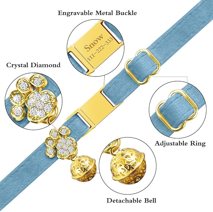 Personalized Breakaway Cat Collars - Magnetic Buckle, Bell - Safety Quick Release, Customized for Girls & Boys Cats- (Velvet-Sky Blue)