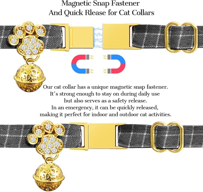 - Magnetic Safety Buckle--Innovative Blend of Safety & Convenience. Our Cat Collar Features an Innovative Magnetic Safety Buckle: 1-Second Quick Release for Emergency Snag-Rescue (Avoids Choking), One-Handed On/Off for Daily Ease, and Secure Hold During Play – Safe for Cats, Effortless for You.