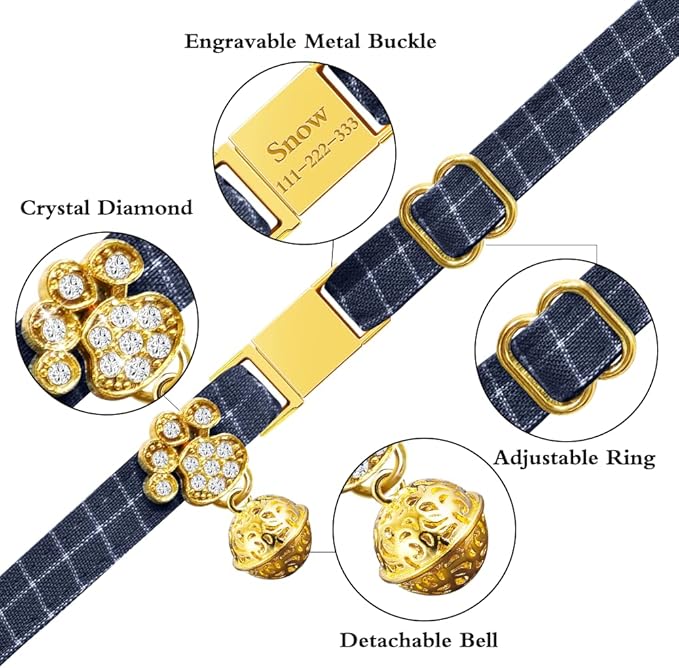 Personalized Breakaway Cat Collars - Magnetic Buckle, Bell - Safety Quick Release, Customized for Girls & Boys Cats- (Checkered-Navy)