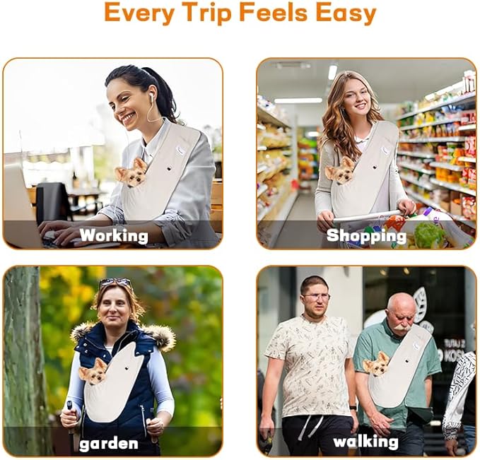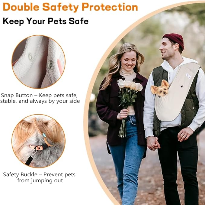 - Safe & Adjustable Design: The puppy sling comes with a built-in adjustable safety strap and buckle that securely attach to your pet’s vest harness, preventing accidental falls