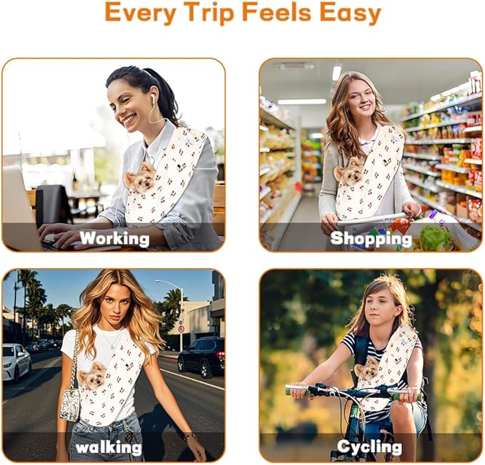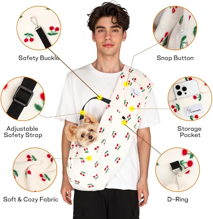 - Safe & Adjustable Design: The puppy sling comes with a built-in adjustable safety strap and buckle that securely attach to your pet’s vest harness, preventing accidental falls