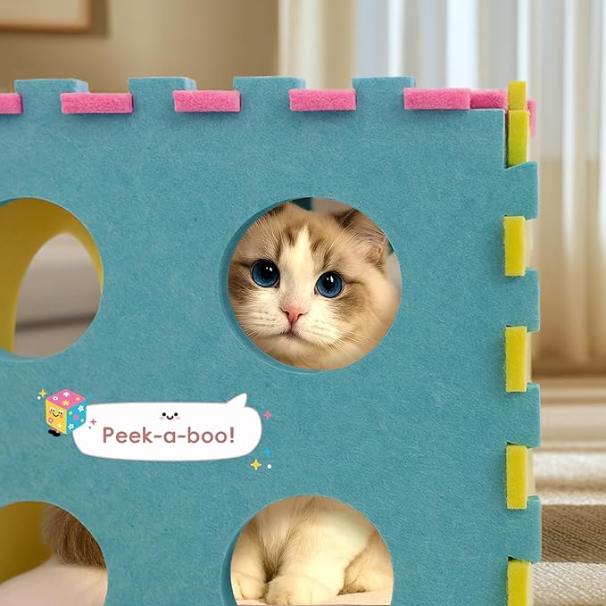 - Which cat wouldn’t love a unique house? This vibrant dice house is a secret hideaway. Peek-a-boo holes invite playful batting at each other. Or they can reach through and catch the dangling cat wand with precision. Plus, this product can be used as a comfy bed or assembled into a fun tunnel