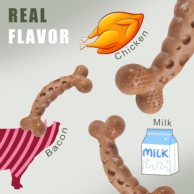 - Discourages Destructive Chewing: The Dog bone toys with bacon flavored can satisfy your dog's natural chewing desire and cultivate healthy chewing habits, helping your dog train his teeth when chewing.