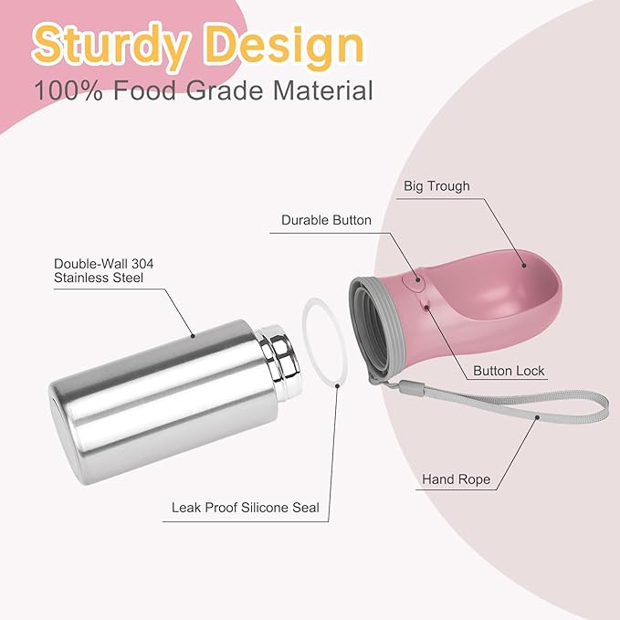 - Durable Material: Made of durable stainless steel, LEAD-free, BPA-free, safe and durable. This portable water bottle for dogs is durable and a reliable companion.