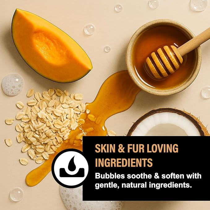 - Product Benefits : Between-Bath Refresh: Keeps pups fresh between full washes, Moisturizing Care: Oatmeal, Coconut, Honey & Pumpkin powders for hydration, Safe for All Dogs: Plant-based, pH balanced, free from parabens and sulfates, Shampoo Alternative: Gentle bubbly soak that cleans without the need for rough scrubbing, Spa-Like Ritual: Turns ordinary baths into a pampering experience Between-Bath Refresh: Keeps pups fresh between full washes, Moisturizing Care: Oatmeal, Coconut, Honey & Pumpkin po… See more