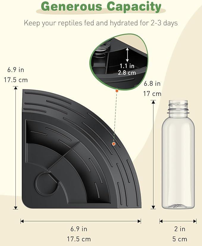 - Dual-Compartment Design: Spacious fan-shaped base with a divider that separates water and food perfectly, allowing your reptiles to eat and drink simultaneously. Generous capacity keeps your crawlers fed and hydrated for 2-3 days, reducing daily refills
